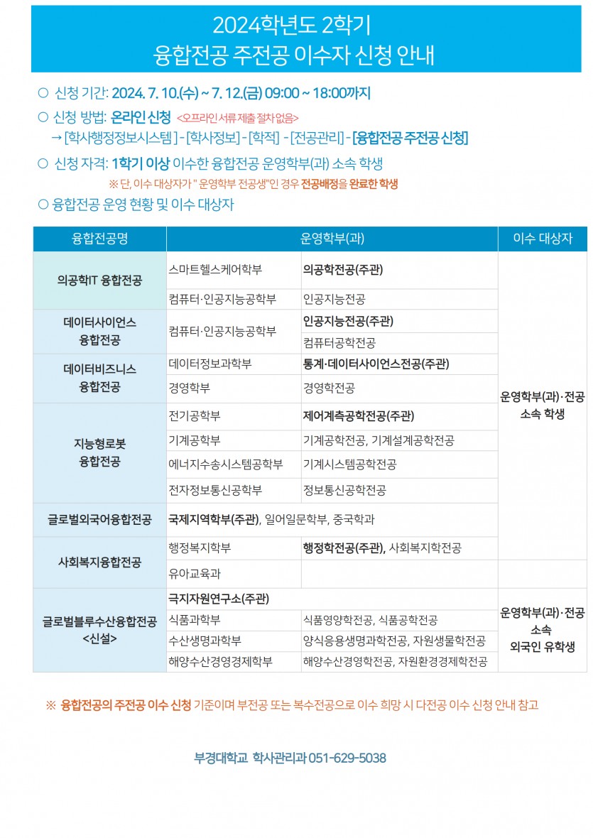 2024학년도 2학기 융합전공 주전공 이수자 선발계획 알림