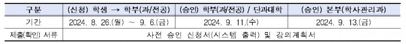 2024-2학기 온라인 공개강좌 학점인정과 관련하여 아래와 같이 사전 승인 신청 기간을 안내하오니 참고하시기 바랍니다.