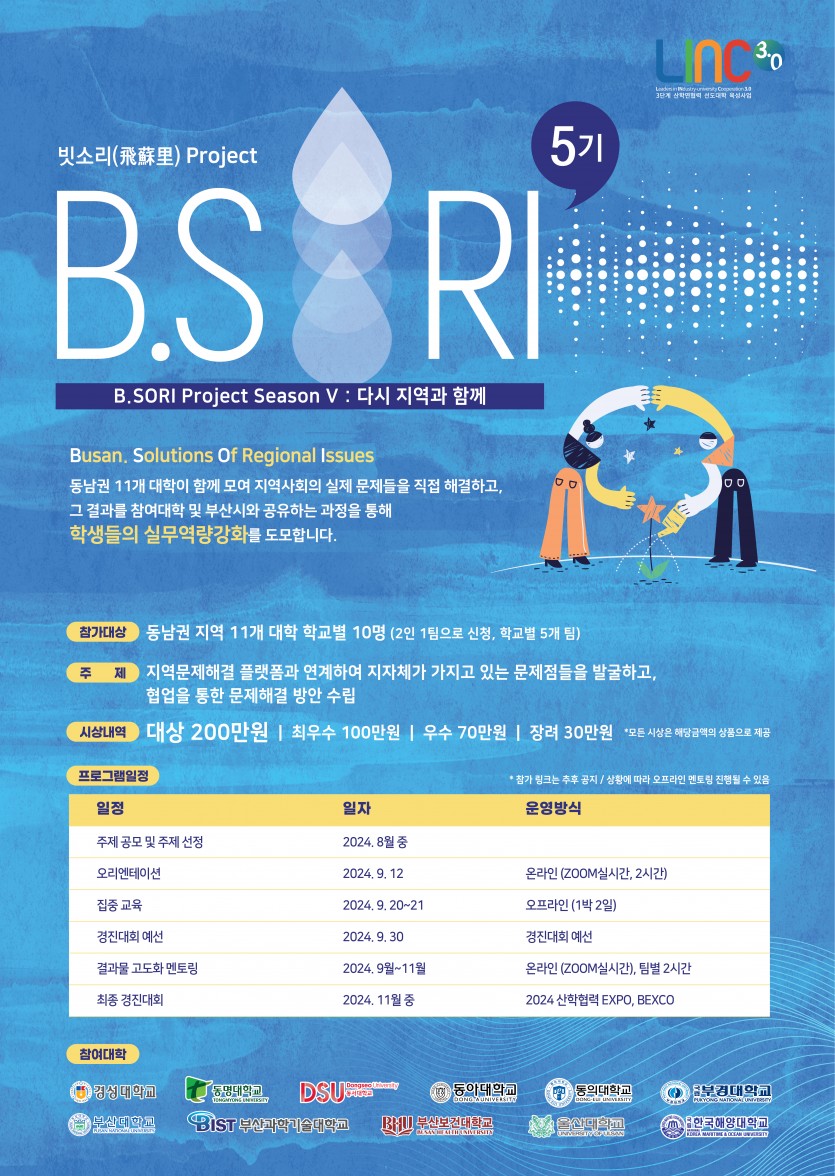 LINC 3.0 사업단에서는「2024년 동남권 11개 대학연합 B.SORI 프로젝트(Season Ⅴ)」를 아래와 같이 실시하오니 참고하시기 바랍니다.