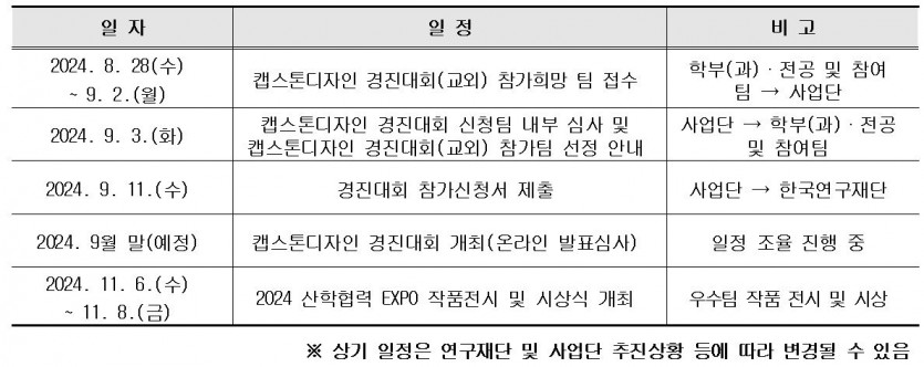 LINC 3.0 사업단에서는 한국연구재단에서 실시하는「2024년도 캡스톤디자인 경진대회」에 우리 대학 학생들의 우수 작품을 출품하고자 하오니 많은 관심과 신청 부탁드립니다.