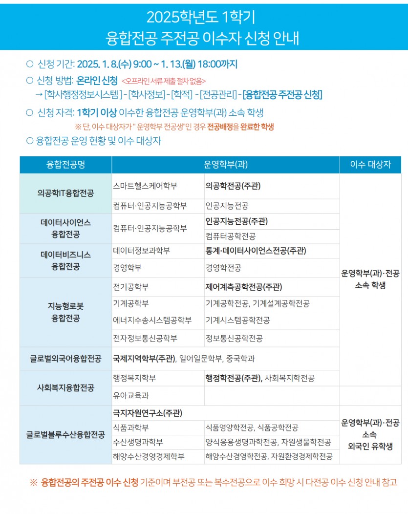 2025-1학기 융합전공 주전공 이수자 신청 안내