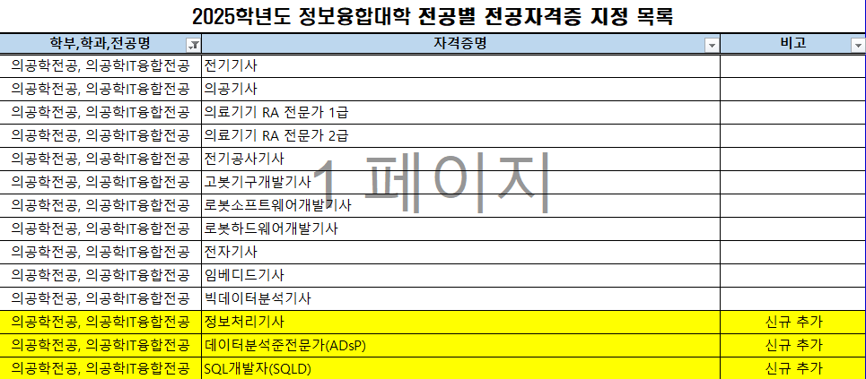 · 소속 전공에서 지정한 전공자격증 ※ 2025학년도 정보융합대학 전공별 전공자격증 지정 목록 사진 확인
