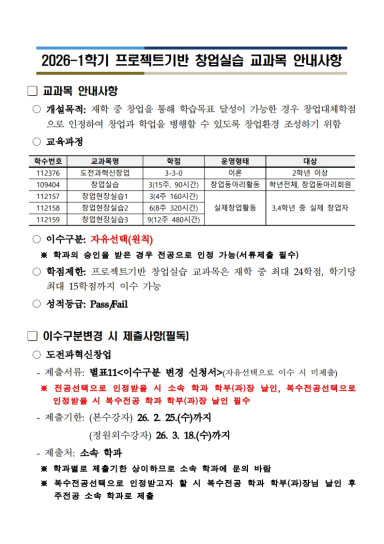 | 2026-1학기 「프로젝트기반 창업실습 교과목」 이수구분변경 신청 안내 | |||
