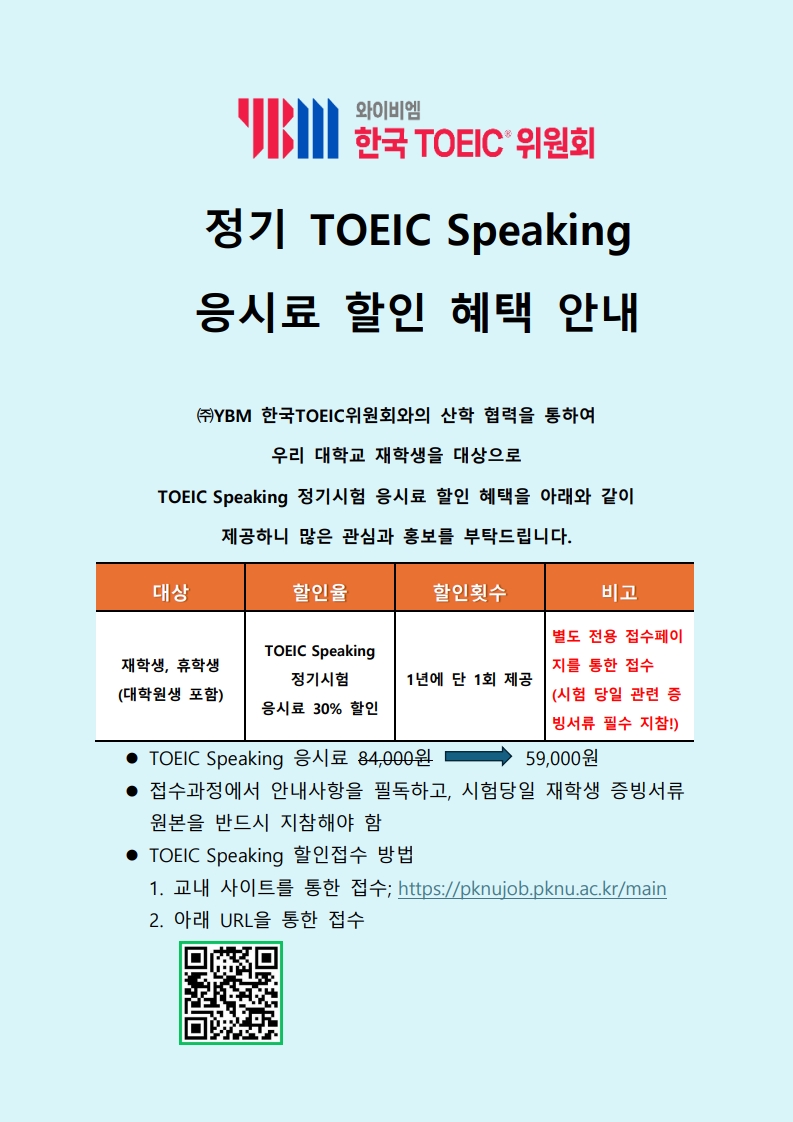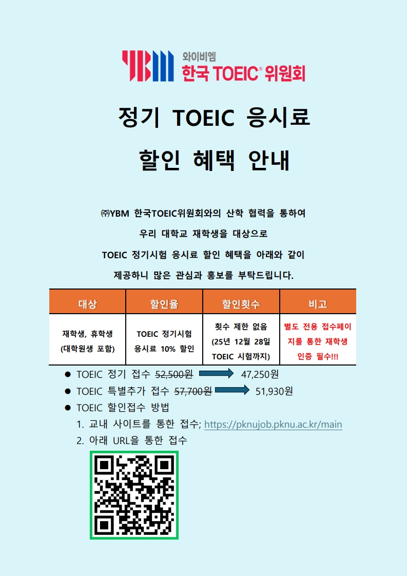 국립부경대학교 재학생(대학원생 포함) TOEIC 및 Toeic Speaking, JPT 정기시험 특별 할인 연장 안내